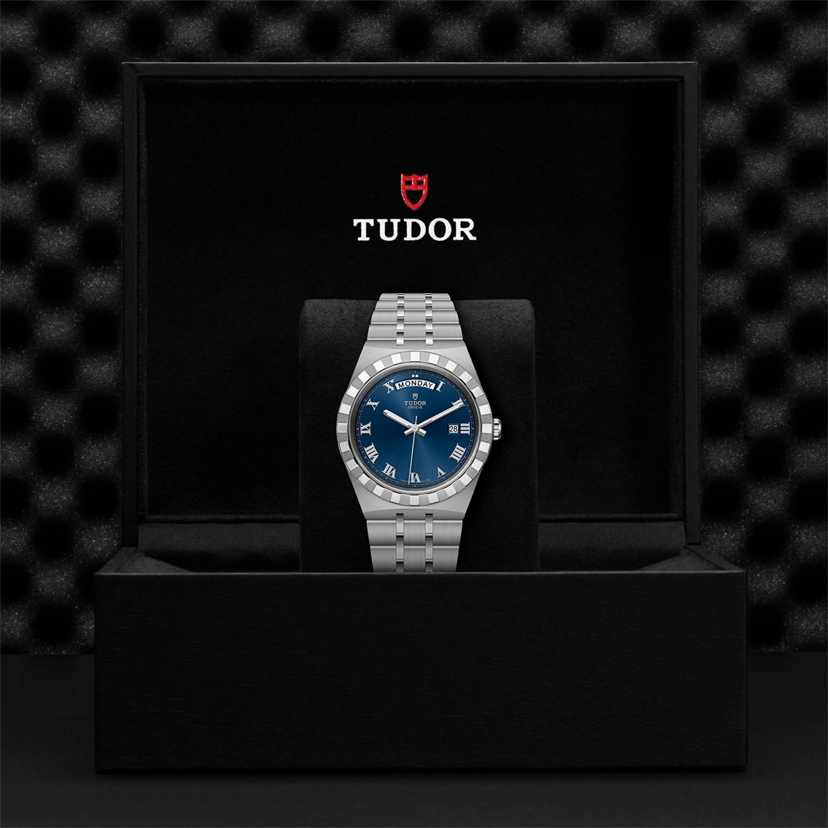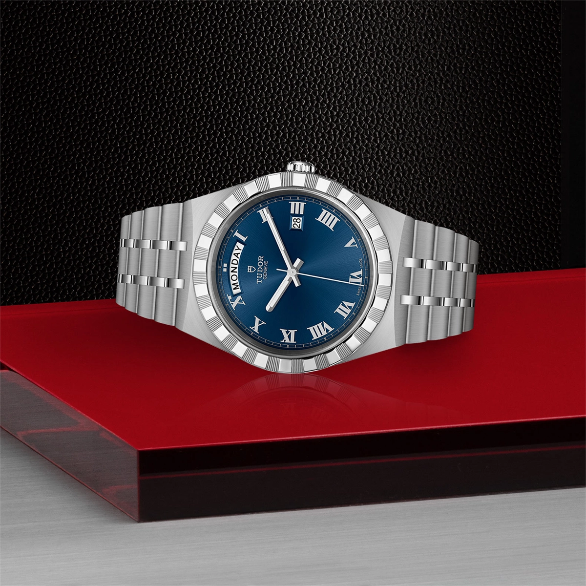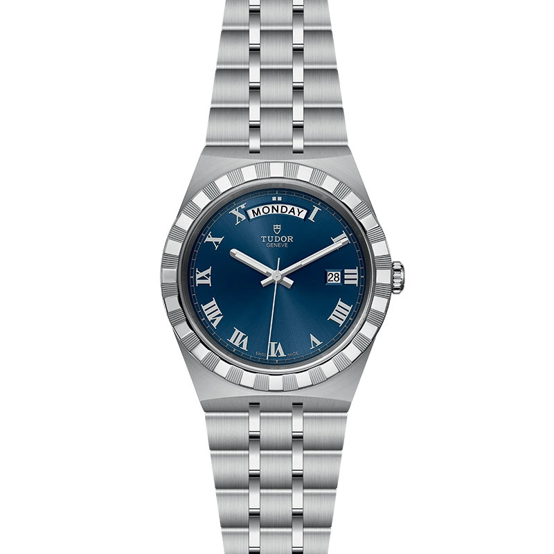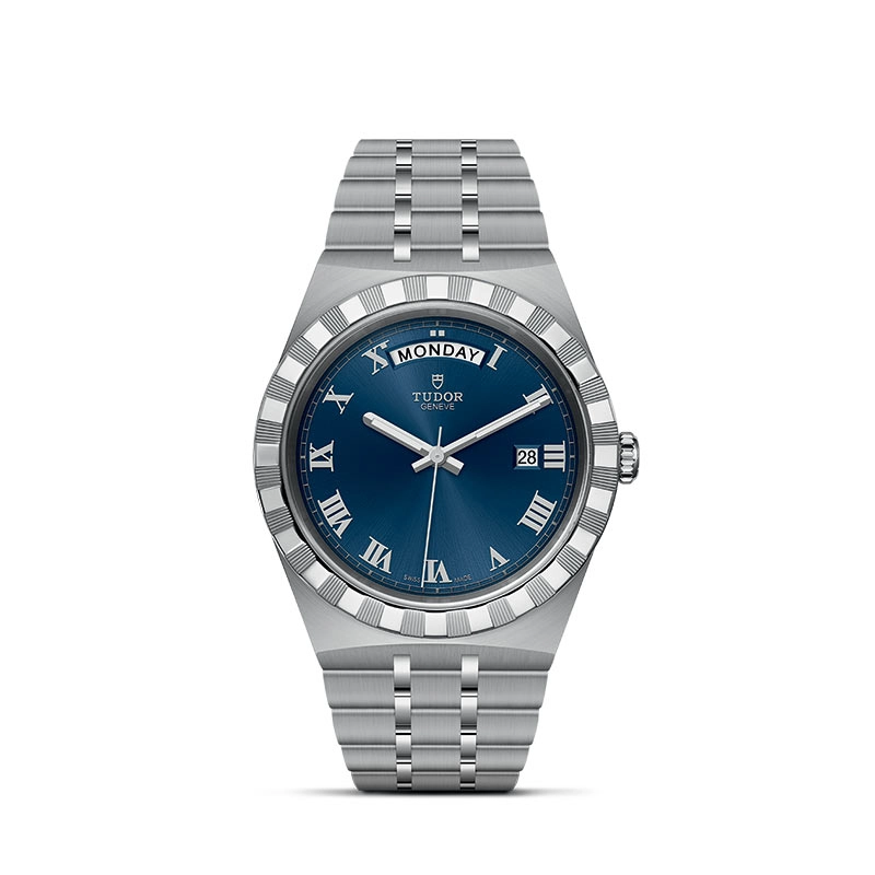 Tudor watch. Royal. Steel case with polished and satin finish. Integrated bracelet in 316L steel, 5 rows, satin-brushed external and central links, polished intermediate links, with folding clasp and safety catch. Synthetic sapphire crystal. Notched bezel in steel with alternating cut grooves and polished finish. Sapphire crystal. 41mm case. Blue roman numeral dial with sunray finish. Day-Date. Self-winding mechanical movement, Calibre T603. Waterproof to 100m.